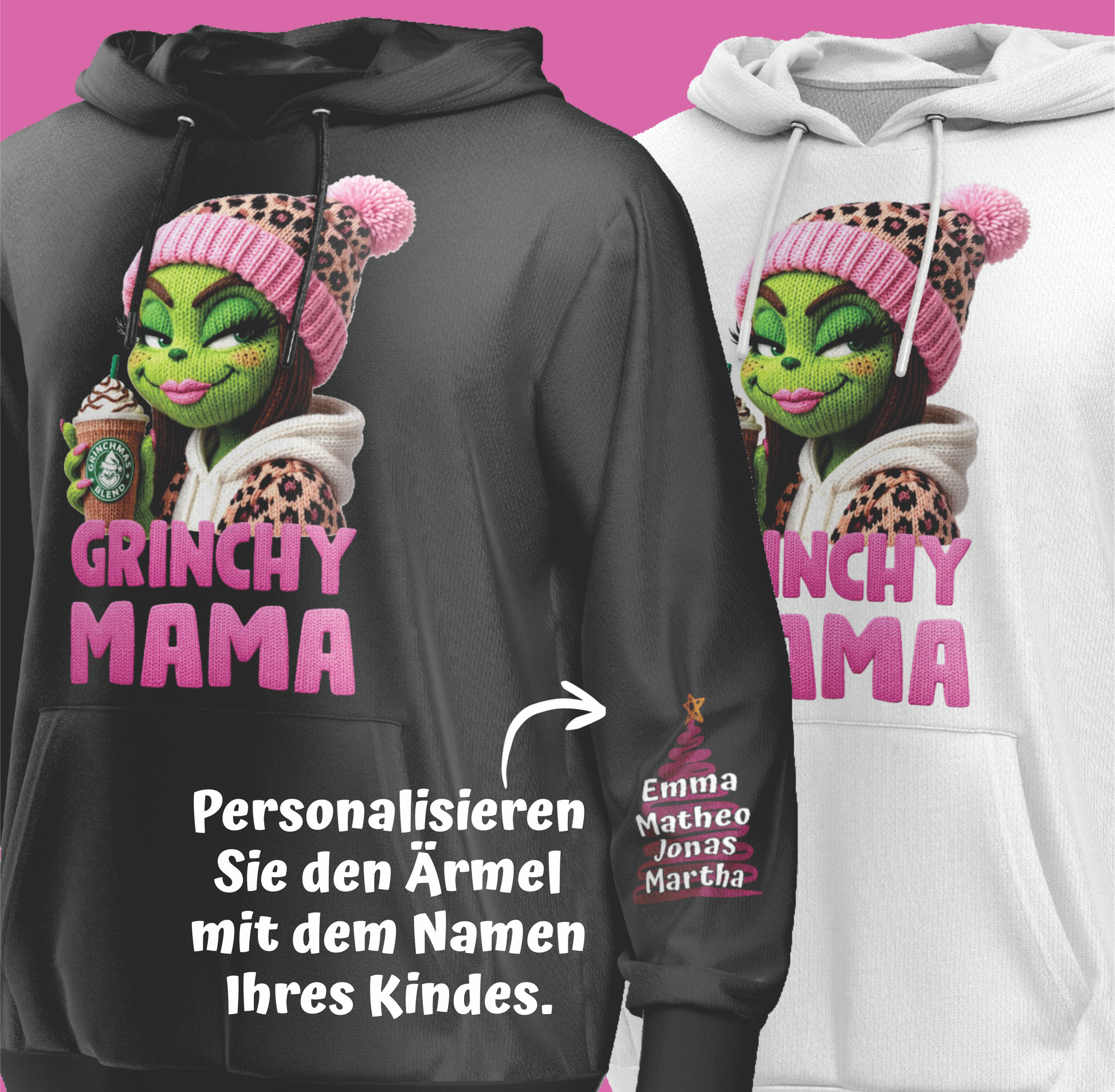 Kuschel-Hoodie aus reiner Baumwolle mit frechen Weihnachtsmotiven – perfekt für alle, die die Feiertage mit Humor nehmen! Das Design "Grinchy Mama, mit Kindername" bringt Grinchmas-Vibes in deinen Kleiderschrank und sorgt garantiert für Lacher. Weich, gemütlich und ideal zum Abhängen oder als originelles Weihnachtsgeschenk für Freunde mit Sinn für Ironie. Weil manchmal braucht man einfach einen Hoodie, der genauso eigensinnig ist wie man selbst!